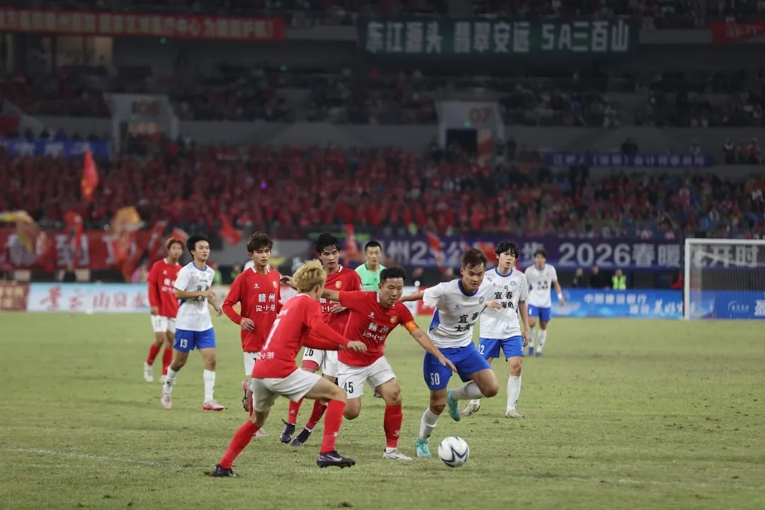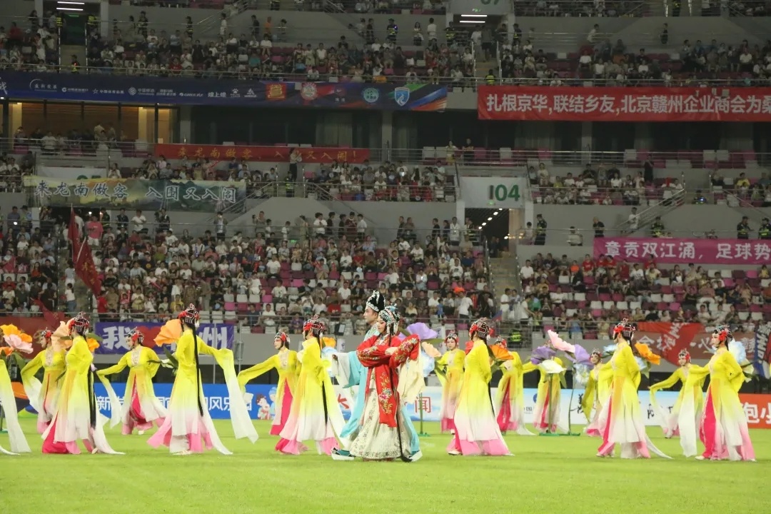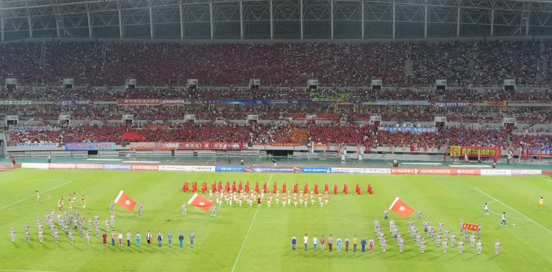 赣超的成功,离不开其与地方文化的深度融合。在赣州,足球不仅是一项运动,更成为红色精神、客家文化与城市气质的集中表达。从《十送红军》的万人合唱,到《长征第一渡》的情景再现,从非遗东河戏的铿锵唱腔,到客家舞龙的翻腾跃动,再到四万观众齐声高唱《歌唱祖国》——每一场赣超赛事,都如同一场“文艺演出中插播足球比赛”的文化盛宴。这种“体育+文旅”的创新模式,让赛事超越了竞技本身,成为展示城市形象的生动窗口。正如一位球迷感叹:“在这里,看球像是参加一场文化巡礼。”就连赛场外临时搭建的“赣超市集”也人头攒动,脐橙片、紫灵芝等特产借助赛事平台走向更广阔的市场,既增强了观众的沉浸感,也让赣州的城市品牌在一次次欢呼中深入人心。