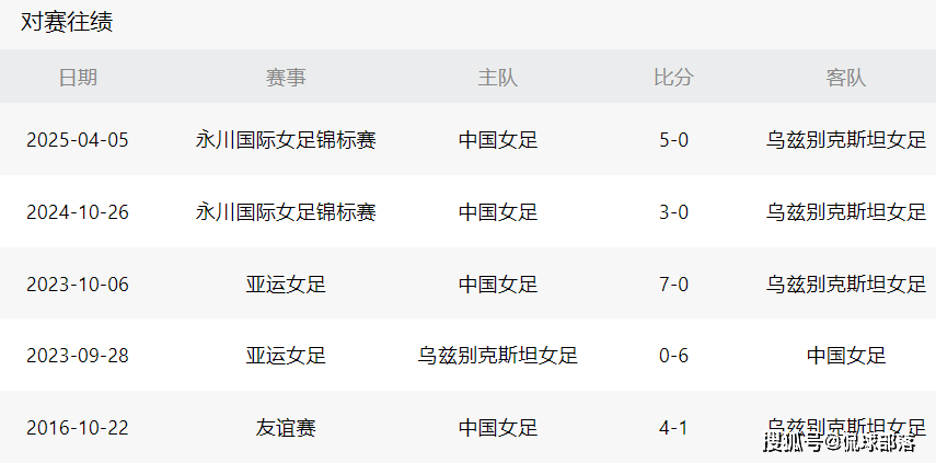 自2016年以来,两队有过5次碰面,中国女足面对乌兹别克斯坦女足取得全胜战绩,打进25球且仅丢1球,攻防达到恐怖的25比1,最近一次较量是去年4月份的永川国际邀请赛,当时中国女足5-0大胜乌兹别克斯坦女足。