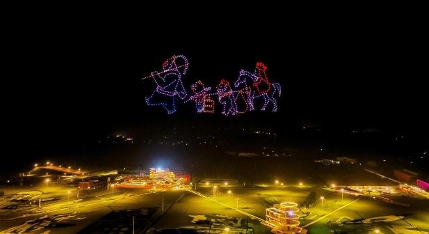 以天为幕、以光为笔。夜色下,千架无人机腾空而起,在夜空中不断变幻炫酷图案和字样,描绘出“哪吒”“孙悟空”“浪浪山小妖怪”“凤凰展翅”等10组精美画面或文字,为现场观众带来科技与艺术深度融合的视觉盛宴,成为众多游客夜游的必选打卡项。