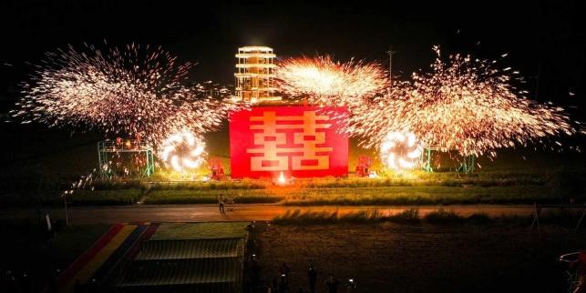 稻田间,非遗打铁花表演绽放火树银花。伴随着激昂的音乐,炽热的铁水在空中四散开来,万千铁花划破夜空,呈现出如烟花般的绚丽景象,为秋夜增添了浓厚的传统文化氛围,现场观众不时发出阵阵惊叹。