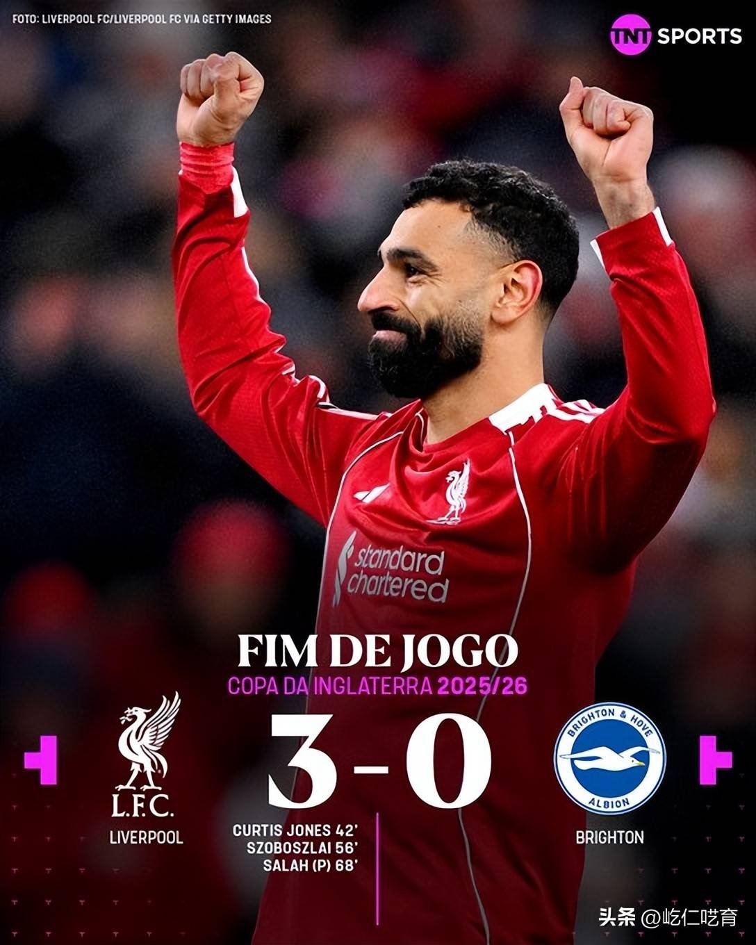 利物浦在足总杯赛场上以3-0的比分战胜布莱顿,顺利晋级下一轮。上半场第42分钟,凯尔凯兹传中,琼斯破门,帮助利物浦打破僵局。下半场,利物浦攻势渐盛,索博斯洛伊和萨拉赫分别在第56分钟和第68分钟进球,将比分锁定为3-0。