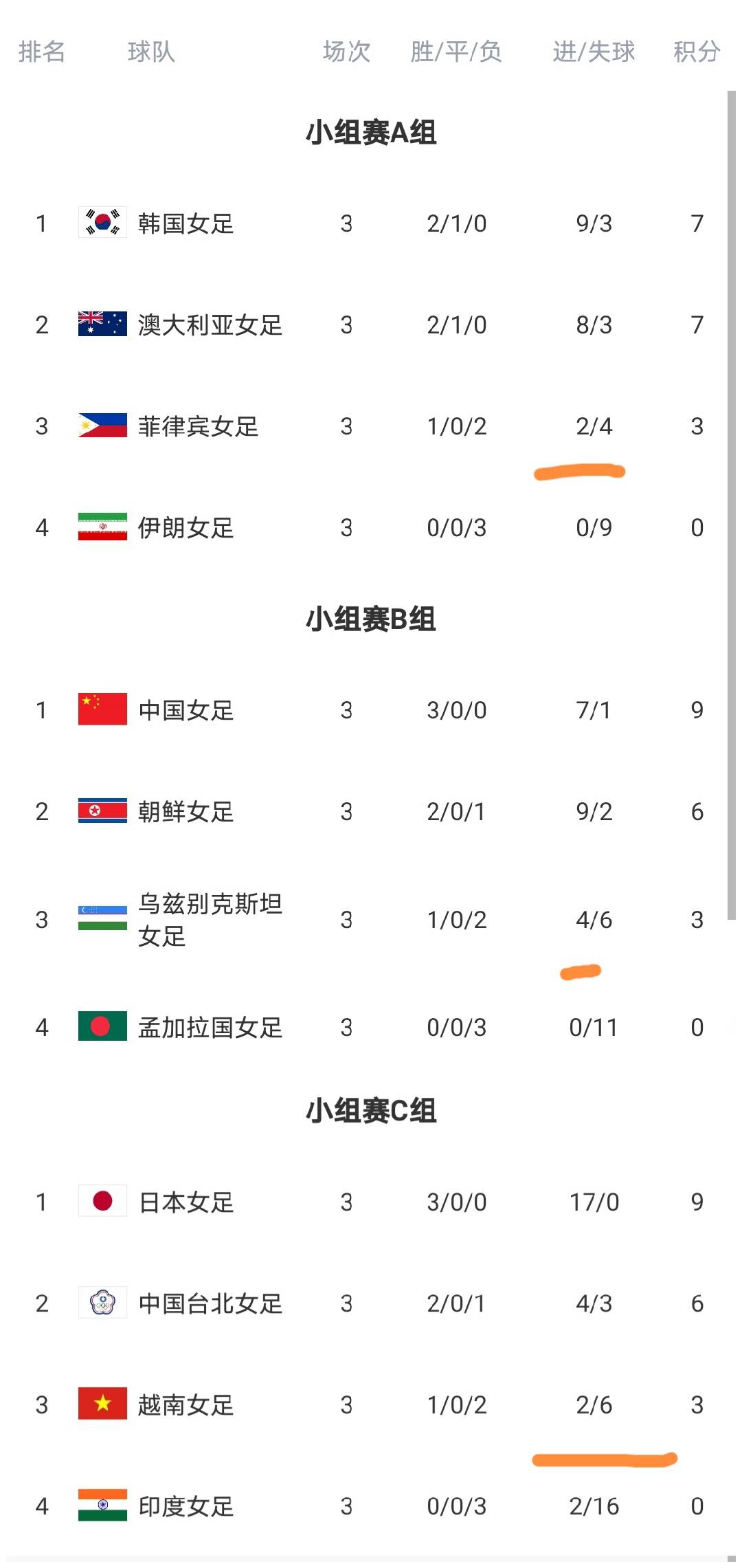 我们先来看看小组赛全部结束之后,最新小组赛积分榜的情况,可以看到A组头名的是韩国,第二的是澳大利亚队,第三的是菲律宾队,第四的伊朗队。而B组第一的是中国队,第二的是朝鲜队,第三的是乌兹别克斯坦队,第四的是孟加拉国队,而C组第一的是日本队,第二的是中国台北队,第三的是越南队,第四的是印度队。每个小组的前二名直接晋级八强,然后成绩最好的两个小组第三也晋级八强,而两个最好成绩小组第三是乌兹别克斯坦队和菲律宾队,而越南队因为净胜球处于劣势,所以越南队虽然也是排名小组第三,但是却遭淘汰。